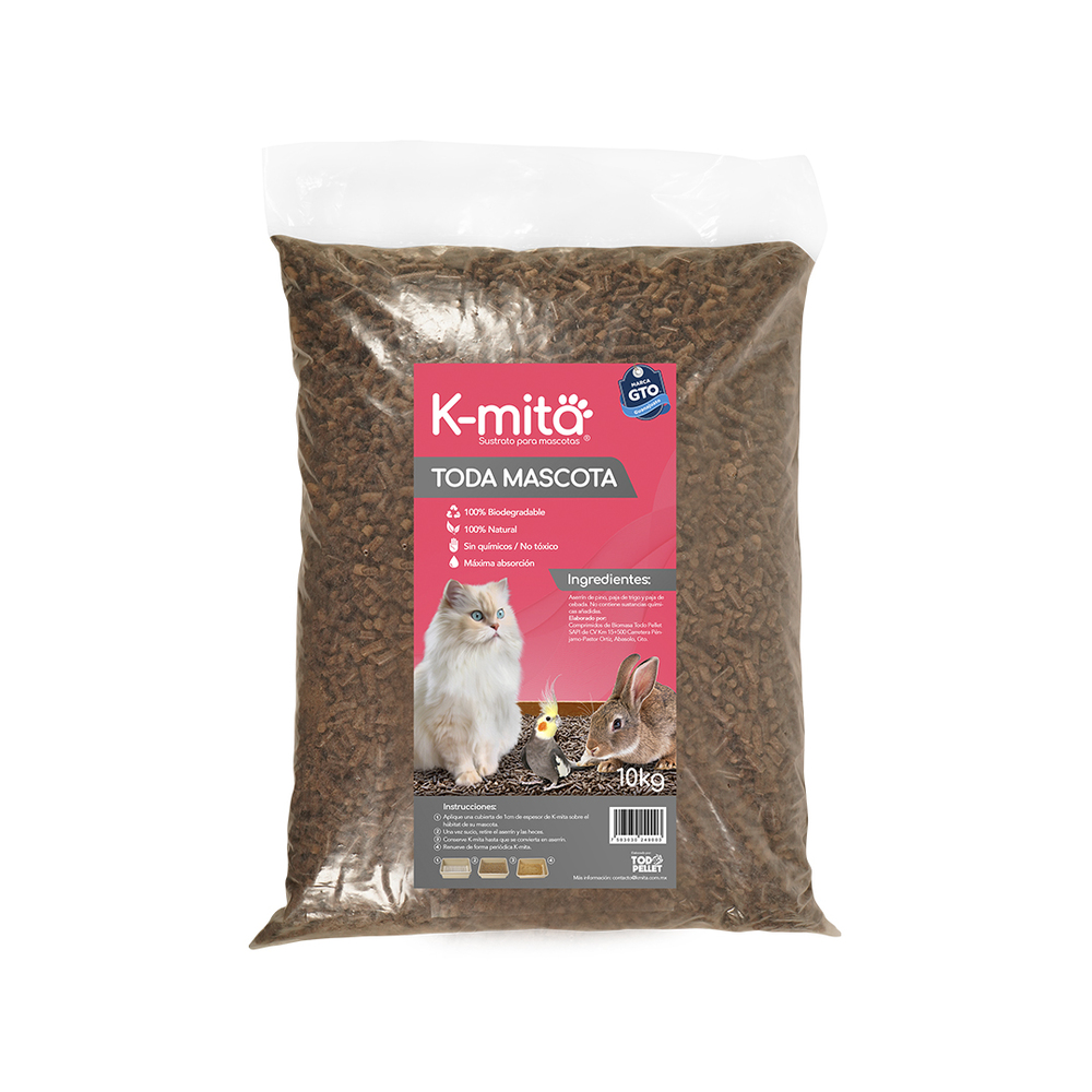 Kmita, es Arena Biodegradable con un sustrato moderno para gatos 100% natural, no tóxico. Hecho con aserrín de pino y paja de cereales. Ideal para gatos, perros, reptiles y mamíferos pequeños.